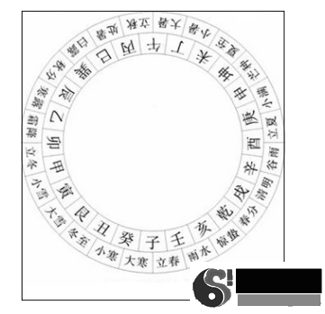 风水与节令是密不可分互通的,节令有气侯暑寒之变,有一年四季,有五行金木水土之性,相匹配了十二地支的子午卯酉,也相匹配了东南西北方,一液相贯,丝丝入扣。先辈把二十四节气,依据气理与五行都融合于罗经的二十四山中,如下图: