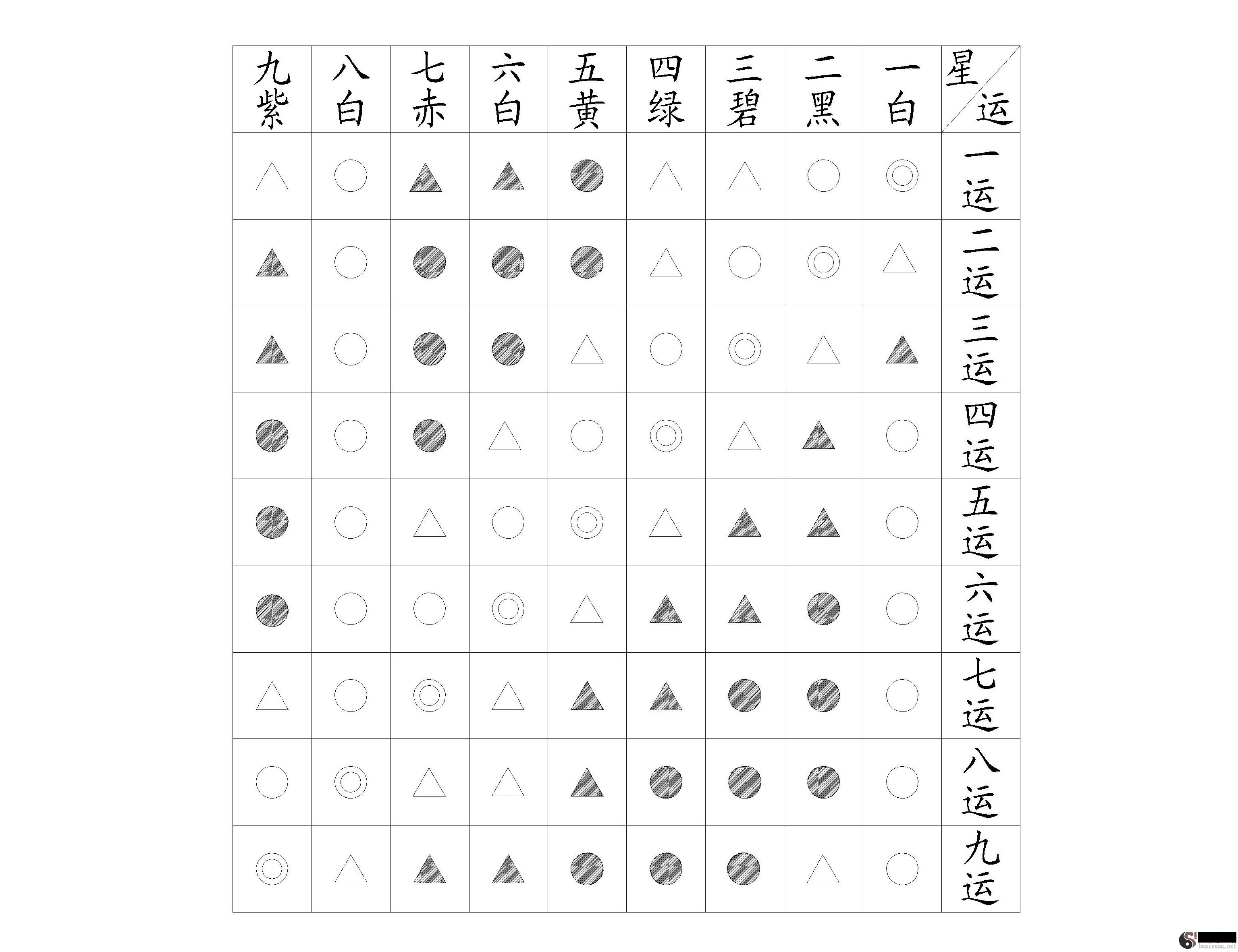 三.玄空飞星风水的较大提升是时钟频率与空间方向作时光结合,即把时钟频率按洛书九宫遍布,因而时钟频率的数不胜数切分为以九为周期时间的周而复始,洛书九宫已遍布九数,时钟频率和洛书九宫结合后,以洛书数意味着时钟频率称之为运,九数各自意味着九个时钟频率称之为九运;而洛书数又意味着阴阳五行之气,故时钟频率与洛书结合后数即是运也是气称之为运势,结合后的后洛书盘称之为运势盘,也称天盘。