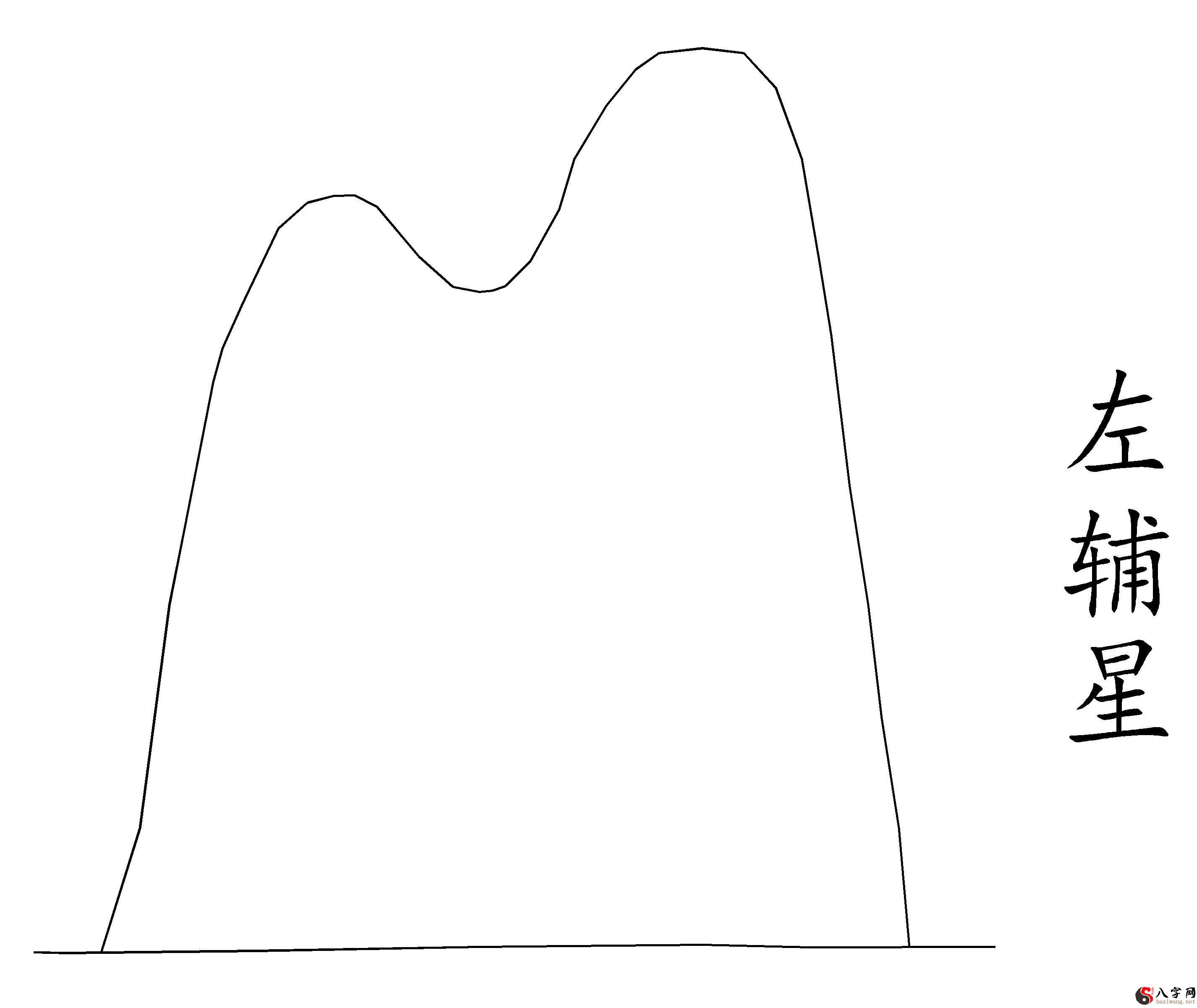 8.左辅星:左辅星山型也形园体大,但左辅星山上不仅有又圆高大挺拔的峰顶、还有一个山峰,二山一前一后似骆驼峰,沒有别的齿耙状山峰,因而左辅星为吉, 五行属金。